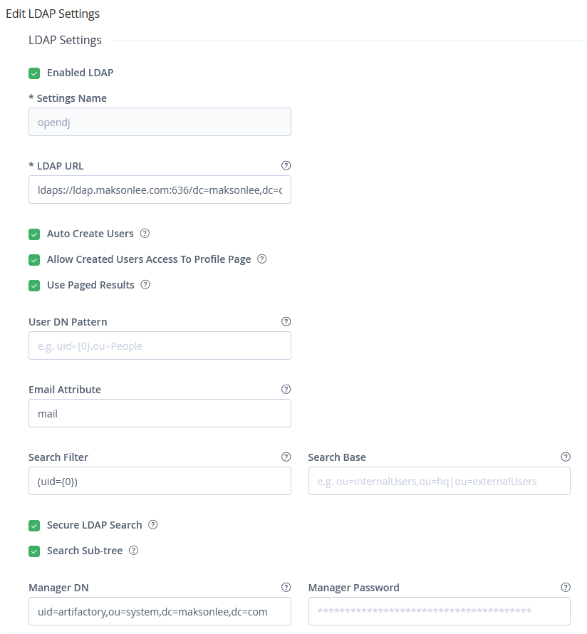 | Manager DN | uid=artifactory,ou=system,dc=maksonlee,dc=com |