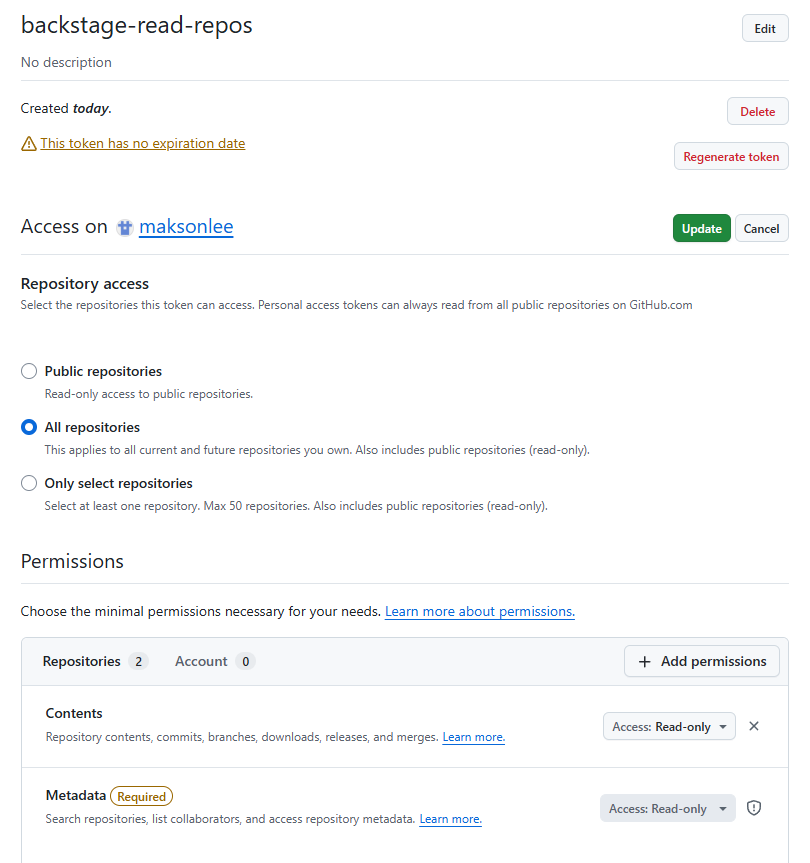 backstage-read-reposwith Contents: Read-only and Metadata: Read-only for all repos undermaksonlee. - Configured