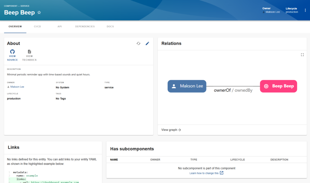 metadata.name: beepbeep→ entity reference becomescomponent:default/beepbeep.github.com/project-slug: maksonlee/beepbeep→ ties this entity back to the GitHub repo.owner: user:default/maksonlee→ I own the app as a user entity (synced from LDAP).