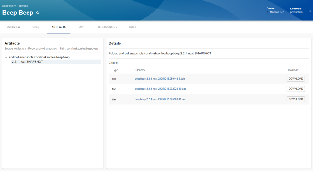 This guide shows how to add an Artifactory-powered “Artifacts” tab to Backstage entities. The tab displays a folder tree on the left, a details table on the right, and opens downloads in a new browser tab (so Artifactory can handle authentication).