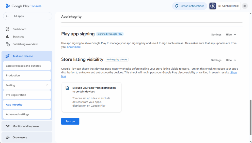 - Open App A → Test and release → App integrity → Play app signing → Settings.