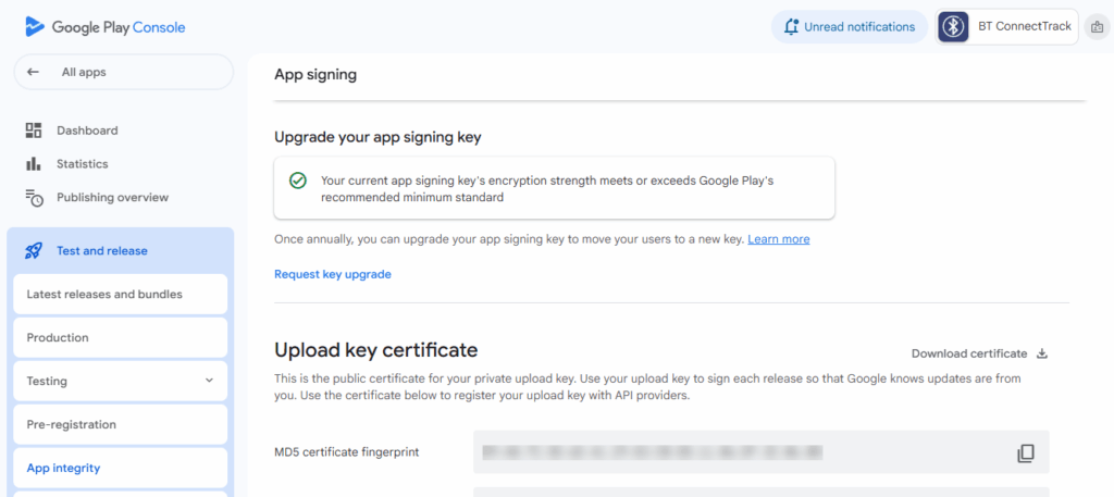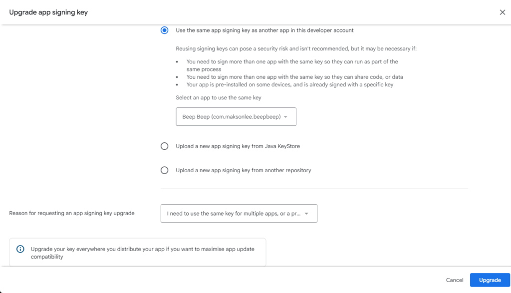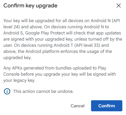 - No “Request key upgrade”: Upload any AAB to Internal testing and refresh.