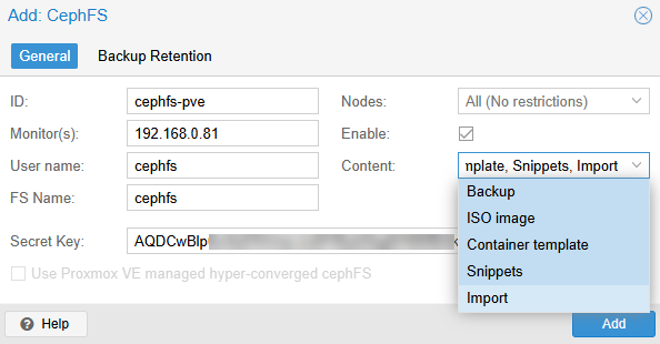 cephfs: cephfs-pveentry in/etc/pve/storage.cfg - Save your key into