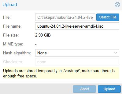 Choose your ISO file (for example ubuntu-24.04.2-live-server-amd64.iso) and click Upload.