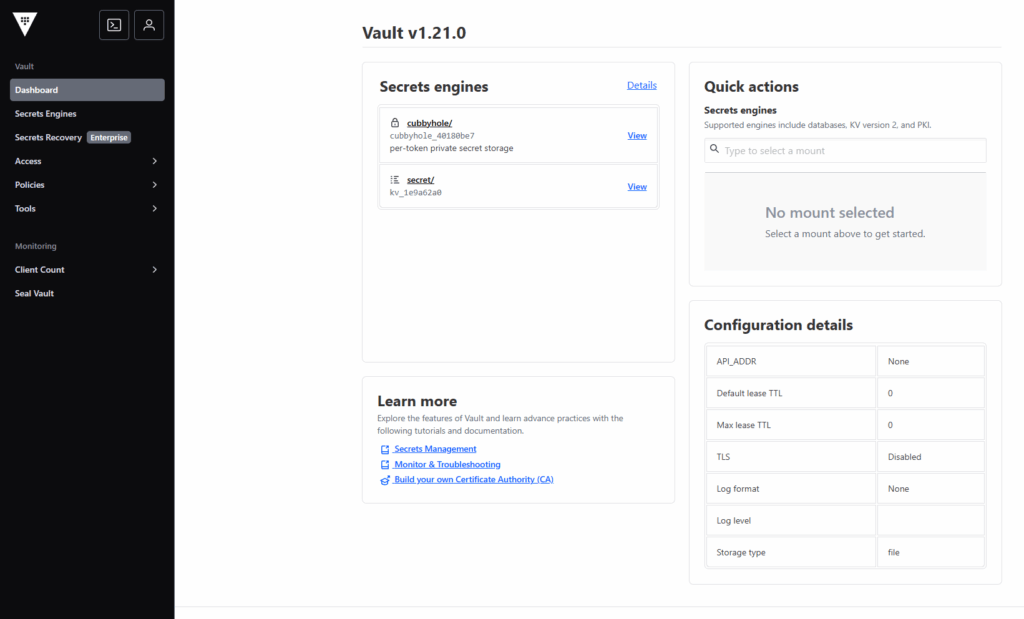 This guide installs Vault OSS on an EC2 Ubuntu 24.04 instance, enables AWS KMS auto-unseal, and exposes the Vault UI over HTTPS using NGINX + Certbot. We’ll keep Vault bound to localhost and put NGINX in front.