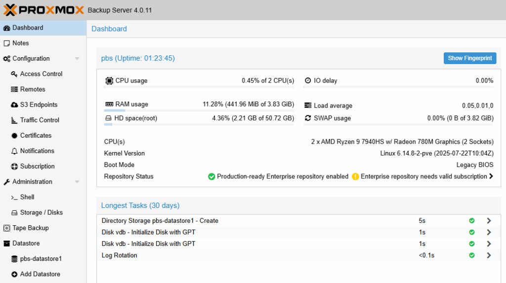 - Add PBS as Proxmox Backup Server storage in Proxmox VE using the fingerprint button
