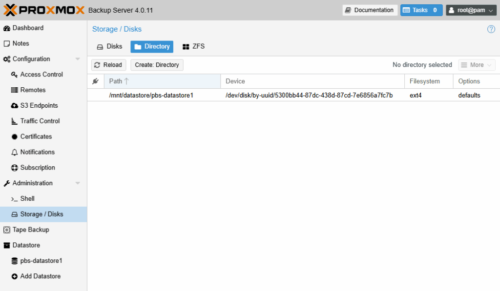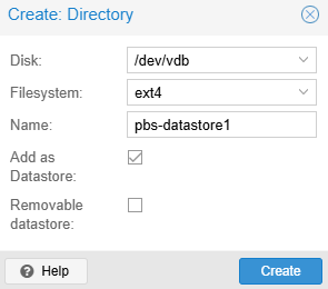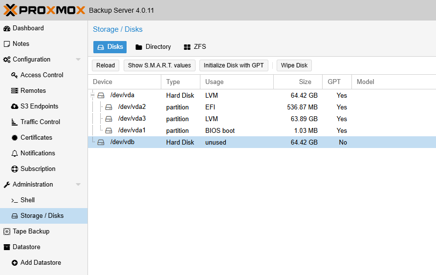 Now we configure the second disk as a datastore for backups. No shell, no fstab, all via the web UI.