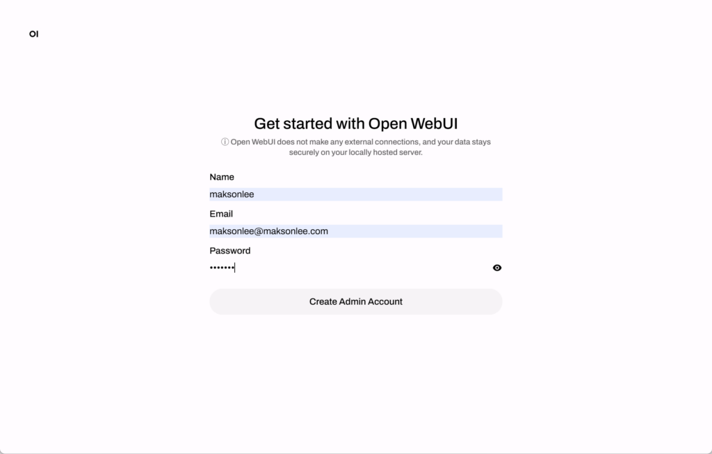 On first launch, Open WebUI will show the account creation screen. Create the admin account and sign in.