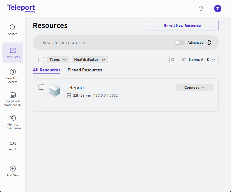 After login, you should land on Resources, and Teleport typically already shows the Teleport server itself as an SSH resource.