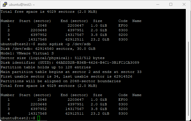 - [curtin, in-target, --target=/target, --, bash, -euxc, 'DISK1=/dev/<!--# echo var="disk1" -->; DISK2=/dev/<!--# echo var="disk2" -->; if [[ "$DISK2" == *nvme* || "$DISK2" == *mmcblk* ]]; then PSEP="p"; else PSEP=""; fi; if ! lsblk -dn "$DISK2" >/dev/null 2>&1; then echo "WARNING: $DISK2 not present, skipping mirror setup"; exit 0; fi; echo "Copying partition table from $DISK1 to $DISK2..."; sgdisk --zap-all "$DISK2"; sgdisk --backup=/tmp/d1.gpt "$DISK1"; sgdisk --load-backup=/tmp/d1.gpt "$DISK2"; sgdisk --randomize-guids "$DISK2"; partprobe "$DISK2"; echo "Attaching ${DISK2}${PSEP}2 to bpool as mirror..."; zpool attach -f bpool "${DISK1}${PSEP}2" "${DISK2}${PSEP}2"; echo "Attaching ${DISK2}${PSEP}4 to rpool as mirror..."; zpool attach -f rpool "${DISK1}${PSEP}4" "${DISK2}${PSEP}4"; zpool status']