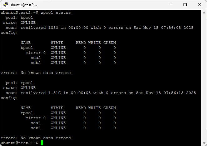bpool = mirror(sda2, sdb2)rpool = mirror(sda4, sdb4)
