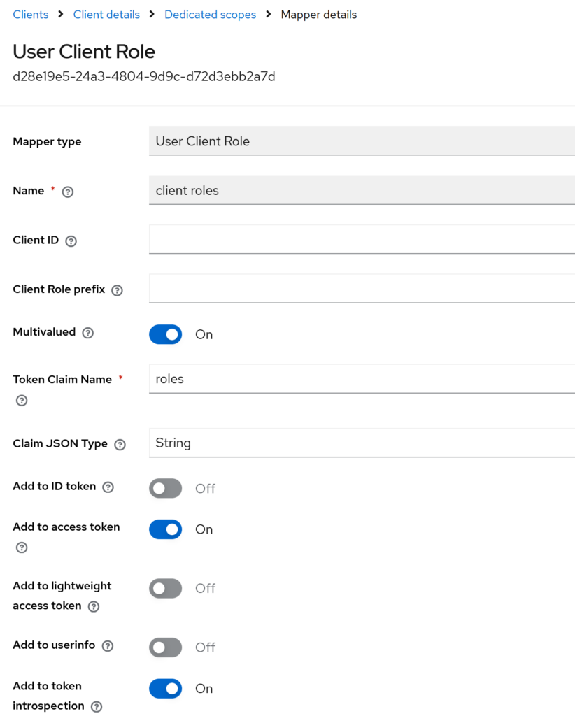 Note: This guide uses client roles (assigned under the ejbca-ra client), not realm roles. Keycloak does not emit client roles as a simple top-level roles claim by default, so we add a mapper to output roles: ["ejbca-admin", ...] for EJBCA role mapping.