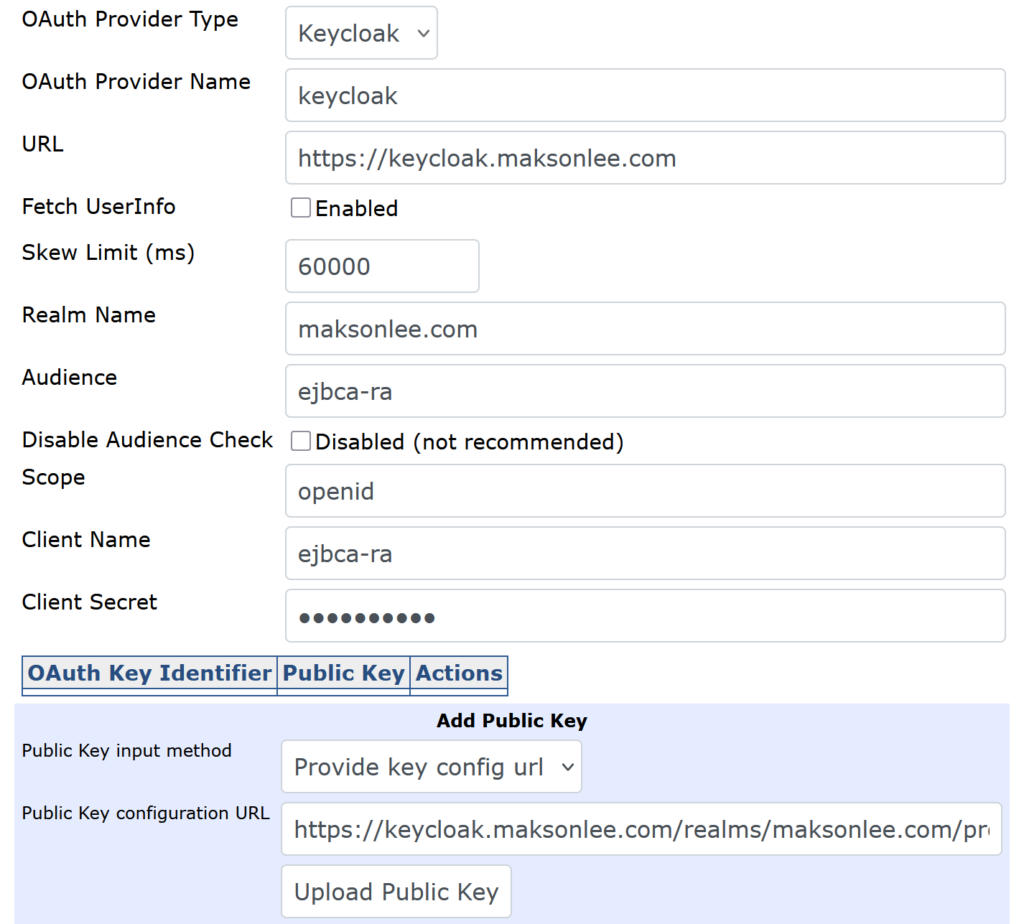 ejbca-ra - Client Secret: (paste the Keycloak client secret)