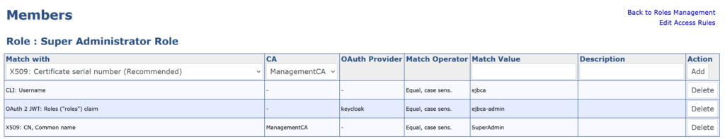 EJBCA Admin Web → System Functions → Roles and Access Rules → Super Administrator Role → Members