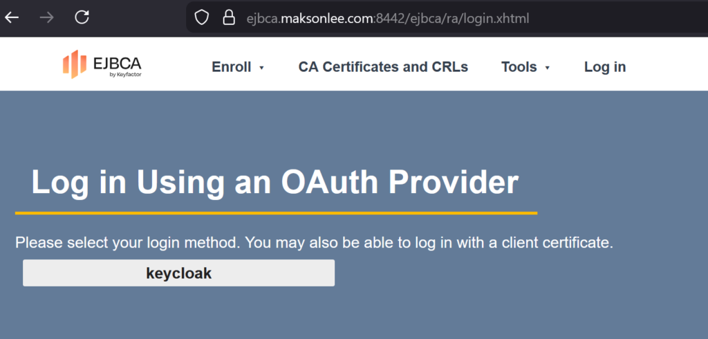 Choose the OAuth provider (keycloak) and log in. If everything is correct, you should land in RA Web with permissions granted by the mapped EJBCA role.
