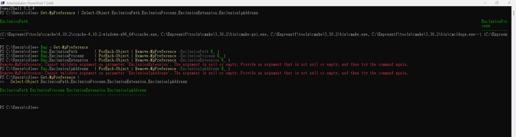 Remove-MpPreference: Cannot validate argument ... The argument is null or empty.