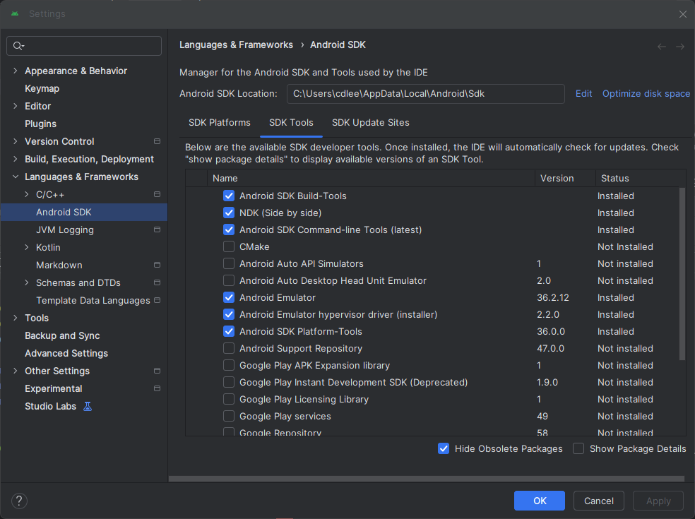 At the top, copy Android SDK Location (e.g. C:\Users\<your-username>\AppData\Local\Android\Sdk).