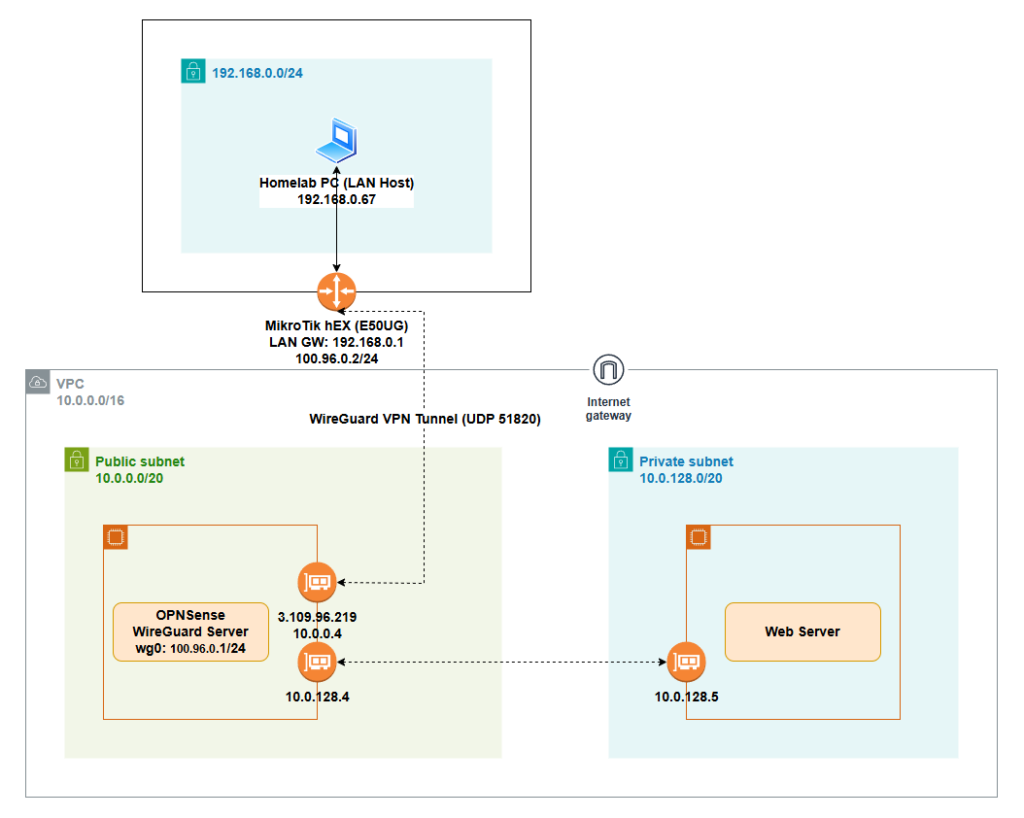 • AWS side: OPNsense 25.7 (WireGuard server / VPN gateway)