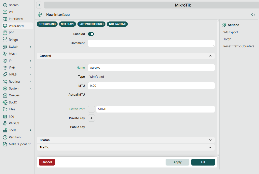 • Listen Port: 51820 (OK to use; MikroTik will still initiate outbound)