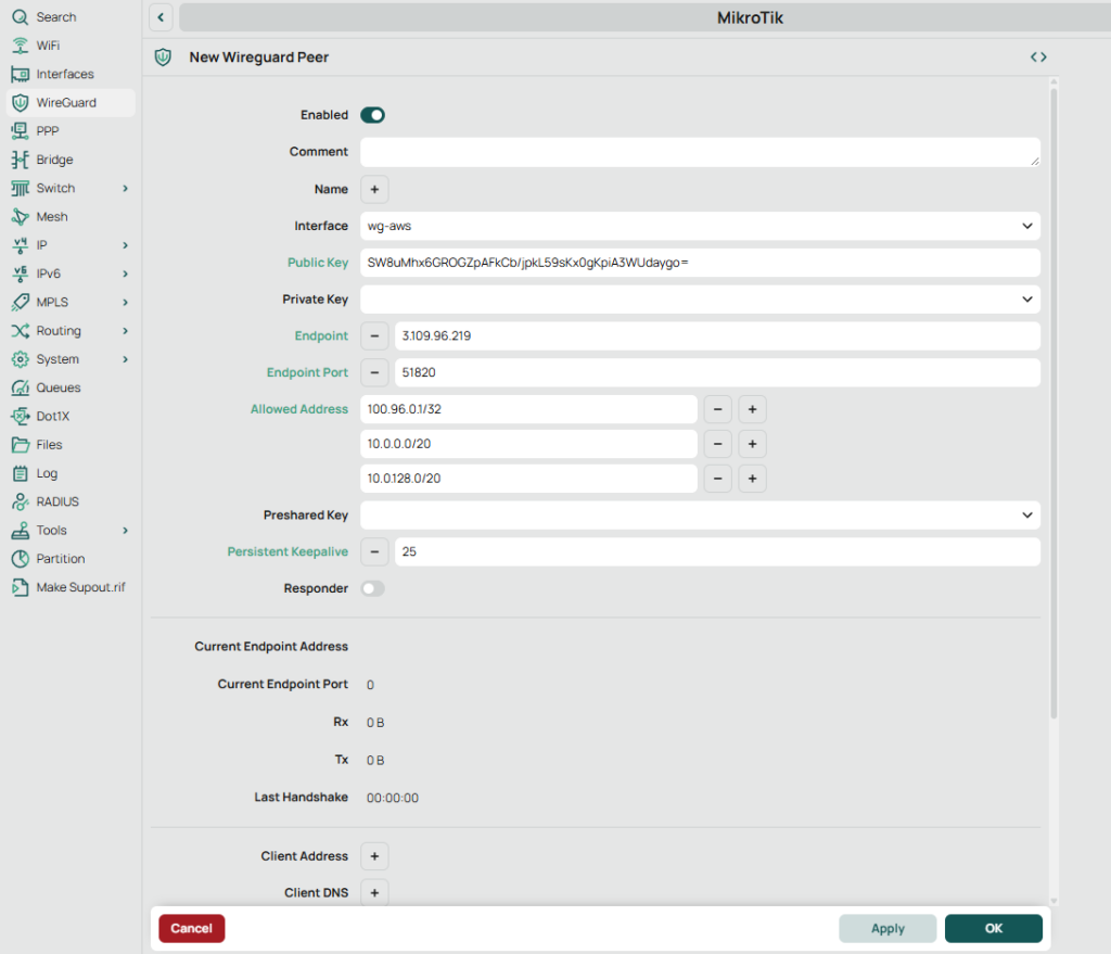 • Public Key: (paste MikroTik WireGuard public key from Step 2)