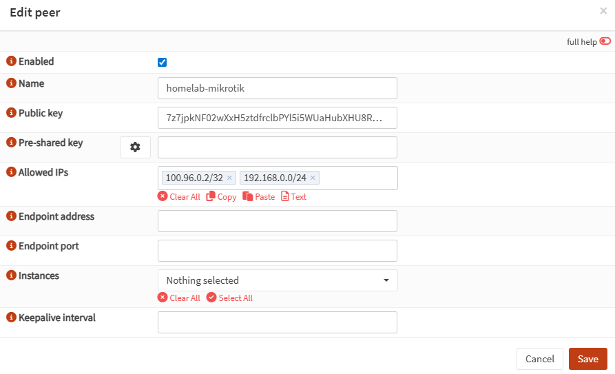 Now that you have MikroTik’s public key, create the peer on OPNsense.