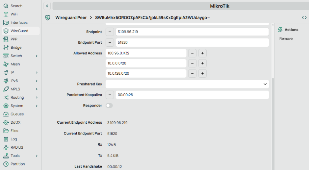 0    interface=wg-aws name="peer1" public-key="SW8uMhx6GROGZpAFkCb/jpkL59sKx0gKpiA3WUdaygo=" private-key="" endpoint-address=3.109.96.219 endpoint-port=51820 current-endpoint-address=3.109.96.219 current-endpoint-port=51820