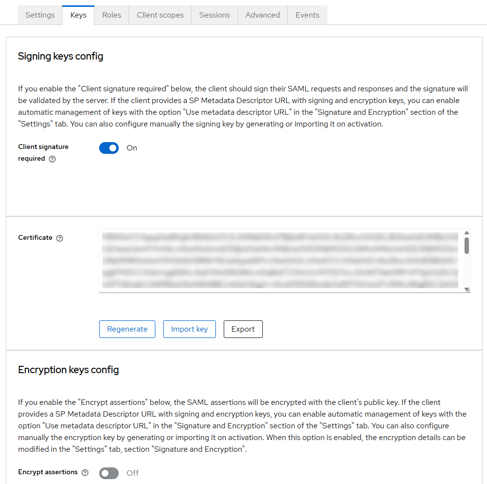 Thanks! You only import sp.crt under Keys → Signing keys config when Client signature required = ON. You don’t put it in Encryption keys config unless you also enable Encrypt assertions (which I keep OFF). I’ve added the screenshot of the Keys tab to the post.