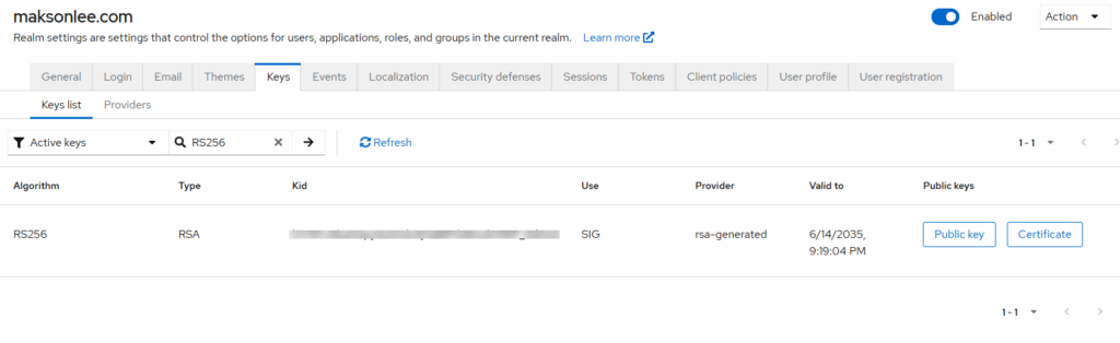 - In Keycloak: Realm settings → Keys → Active → (RS256) → copy the Certificate (X.509 public).